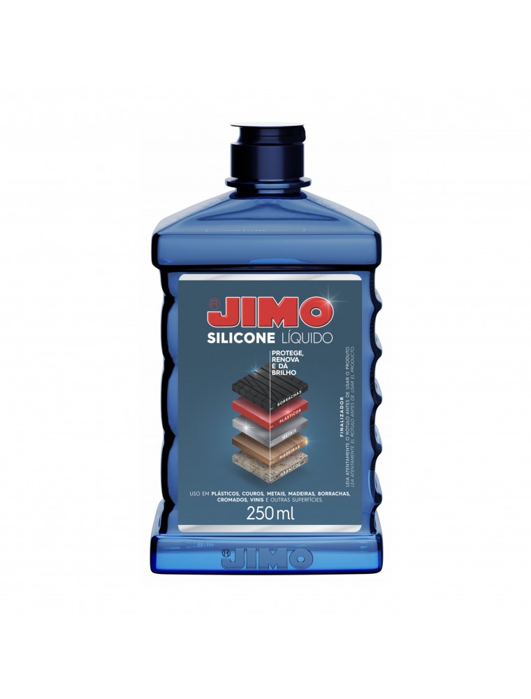 JIMO SILICONE limpa, protege, lubrifica, conserva e dá brilho, destacando a cor de borrachas, plásticos, vinis, madeiras e outras superfícies.