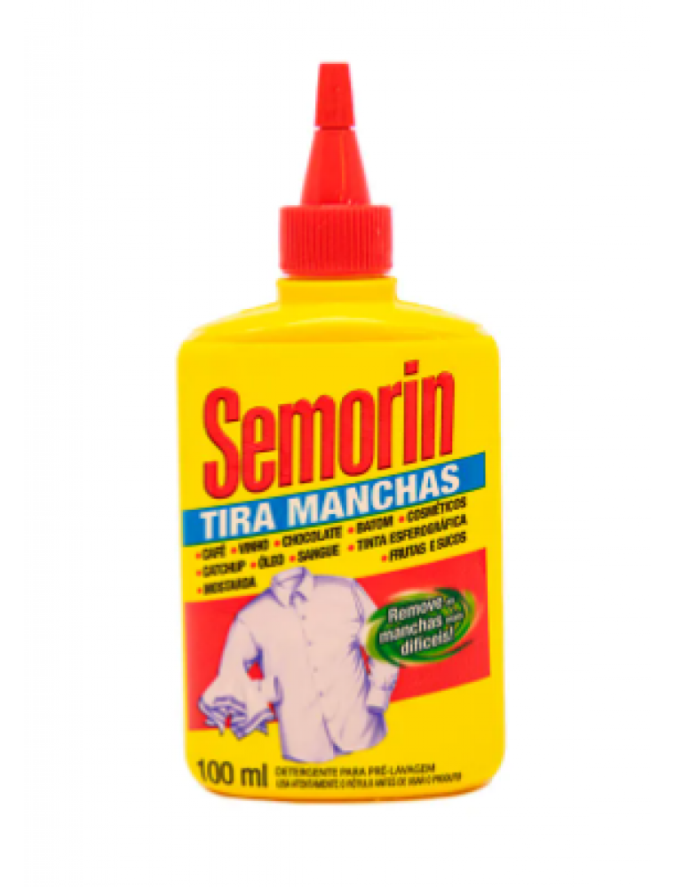 Assim como no tira ferrugem, Semorin foi a primeira marca a lançar um produto que tira manchas de tecidos e roupas no Brasil. Tira manchas Semorin tradicional é ideal para remoção de uma infinidade de manchas difíceis tais como: vinho, sucos, frutas, catchup, óleo, sangue, tinta esferográfica, café, chocolate, mostarda, batom, entre outras de qualquer tecido lavável. É um verdadeiro tira manchas pois é um produto concentrado, que atua diretamente nas manchas e que possui em sua formulação um conjunto de ativos combinados especificamente para tirar manchas de diversos tipos. Aliado com o exclusivo bico aplicador que chega em qualquer cantinho escondido das roupas e evita desperdícios, retira manchas em apenas uma aplicação! É por isso que até hoje é referência de produto tira manchas para todos que exigem qualidade, rapidez e praticidade na remoção de manchas de tecidos.