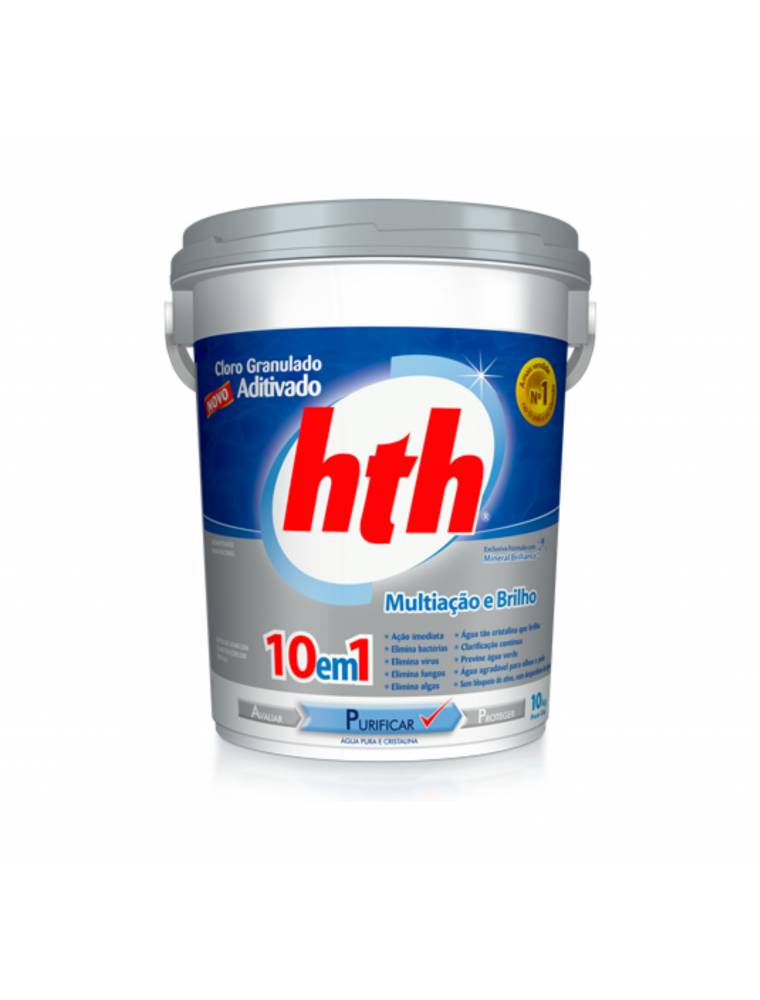 ATUAÇÃO: Mineral Brilliance™ é uma tecnologia exclusiva desenvolvida pela hth® que proporciona uma água com alto brilho. Esse efeito só é possível graças à liberação de íons minerais que deixam a água extremamente cristalina ao ponto de refletir a luz com alta intensidade. O hth® Cloro Aditivado 10em1™ é multiação, elimina bactérias e fungos, dá brilho à água, pois intensifica sua cristalinidade, previne água verde e clarifica continuamente através da eliminação de micropartículas na filtração. O resultado é uma água de piscina tão pura e cristalina que até brilha. VALIDADE: 24 meses