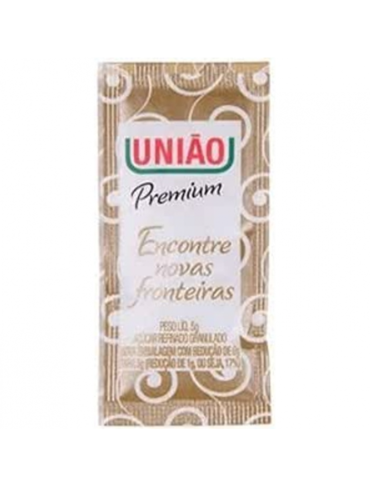 Açúcar união premium sachês(5grs) é o açúcar refinado granulado tipo exportação. Grãos menores e mais uniformes lhe conferem aparência nobre e cristalina, como pequenos diamantes. Absorve menos umidade e fica soltinho por mais tempo. É indicado para adoçar líquidos. União premium em sachê: na medida certa para adoçar de forma prática e higiênica. . Saquinhos de 5 gramas.